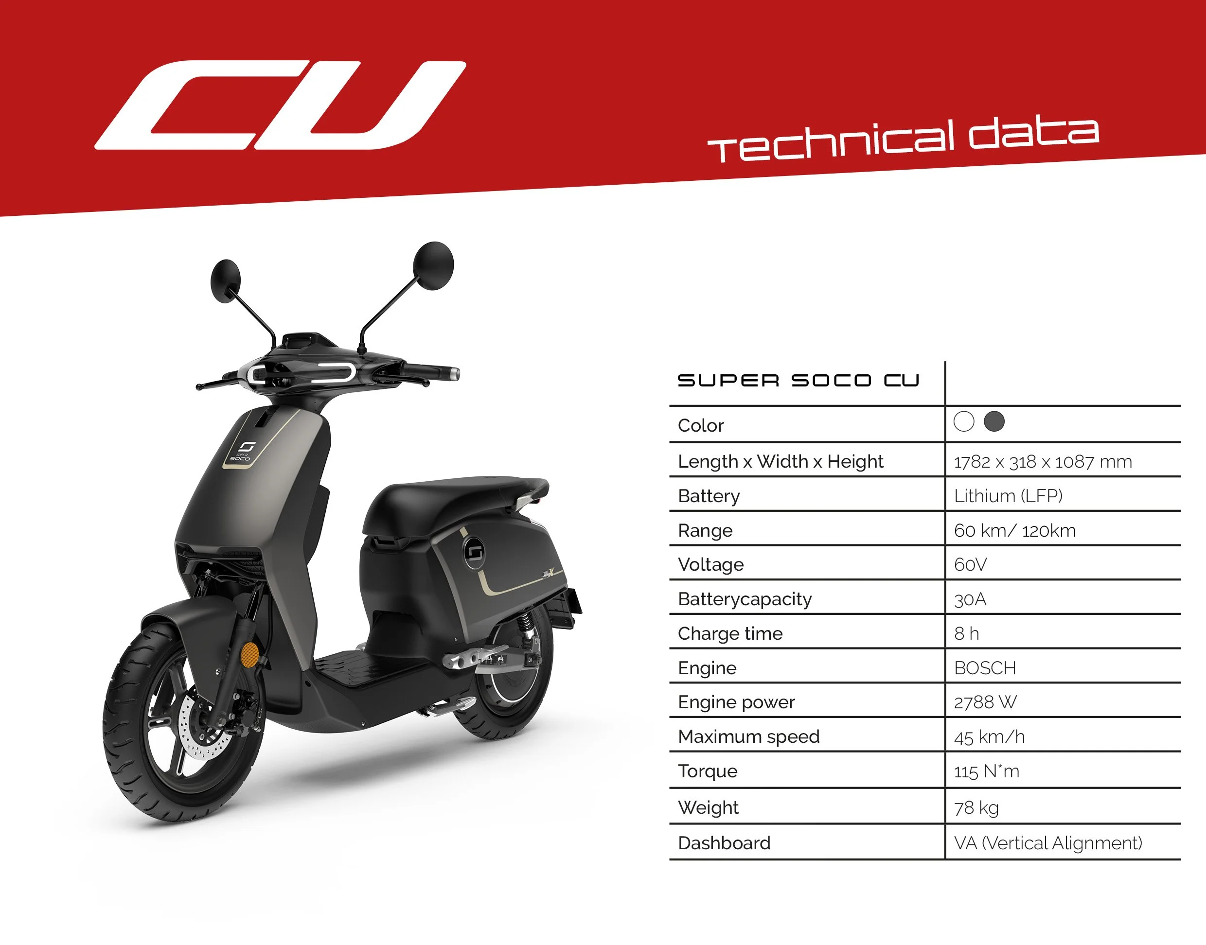 Super Soco CUx is designed and developed for the European market. Generous leg space and comfortable riding posture makes CUx the ultimate commute moped, even if you’re tall. Ride up to 75km/charge. App included for 3 years.