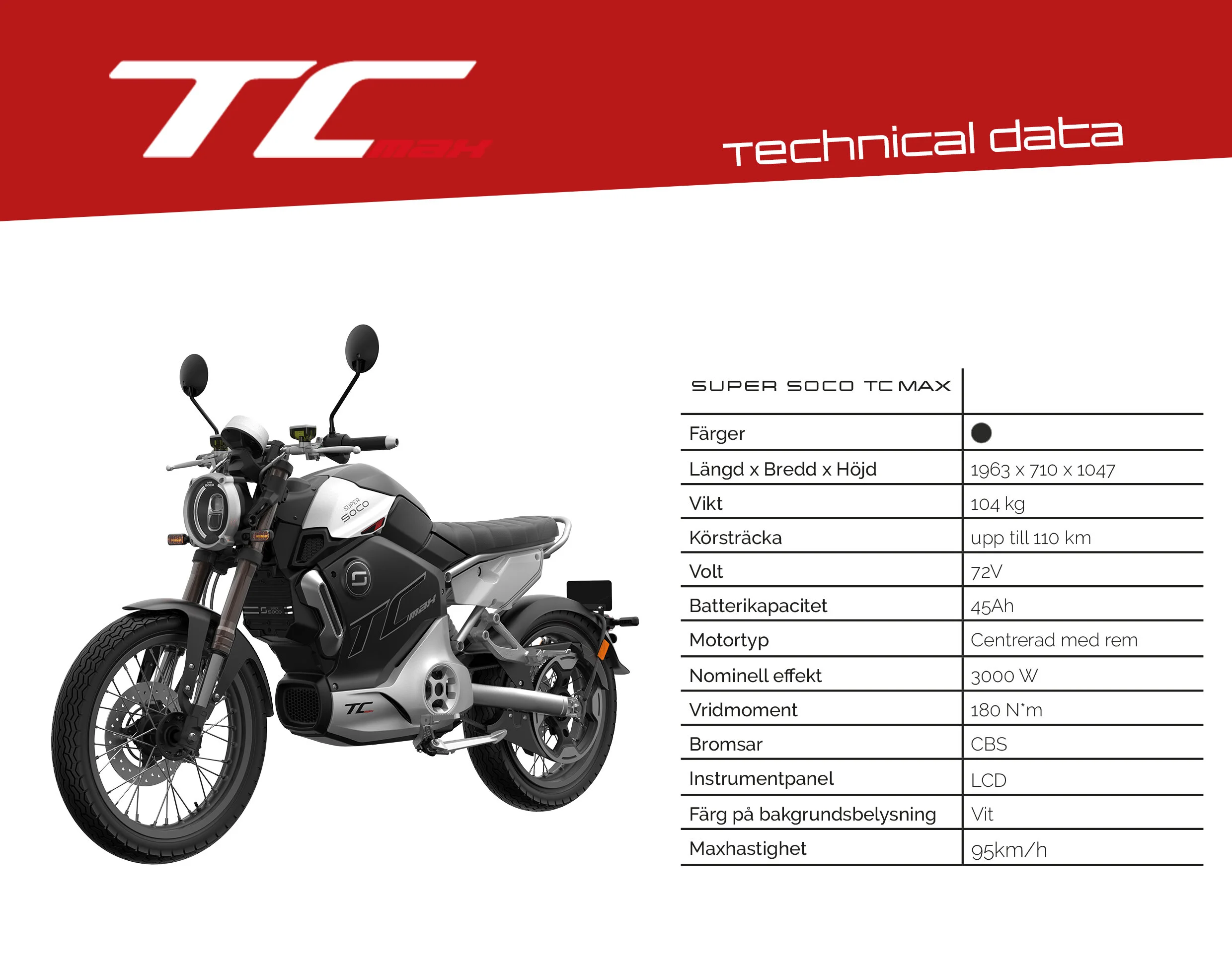 TC Max är en motorcykelversion utvecklad utifrån vår TC klassiker. Här levereras högre hastighet, mer kraft, längre räckvidd och kortare laddningstid.